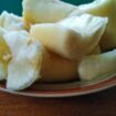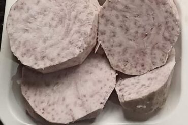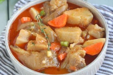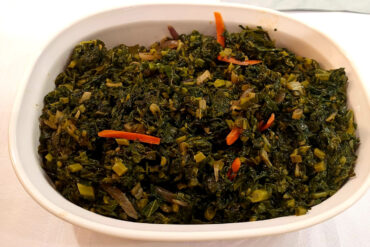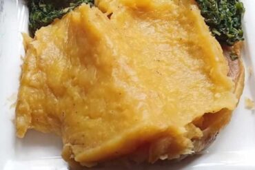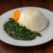 Cow Feet Stew served with Steamed Cassava (Yucca), Matooke (Mashed Banana Plantain) and Sukuma (Green Vegetables)