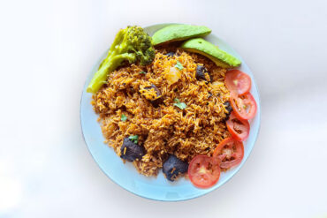 Beef pilau served with Sukuma (Green Vegetables), Kachumbari and Beef stock Gravy.