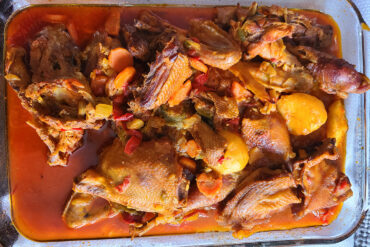 Chicken stew served with Ugali, Matooke (Mashed Plantain), Pilau, Steamed White Rice, Steamed Cassava (Yucca) Sweet potato, Yum Includes: Sukuma (Green Vegetables), Avocado.