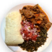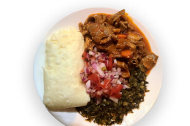 Beef Stew served with Ugali, Matooke (Mashed Plantain), Pilau, Steamed White Rice, Steamed Cassava (Yucca) Sweet potato, Yum Includes: Sukuma (Green Vegetables), Avocado.