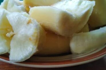 Fried Pork Burt and Cabbages served with Matooke (Mashed Banana Plantain), Steamed Cassava (Yucca) and Kachumbari.